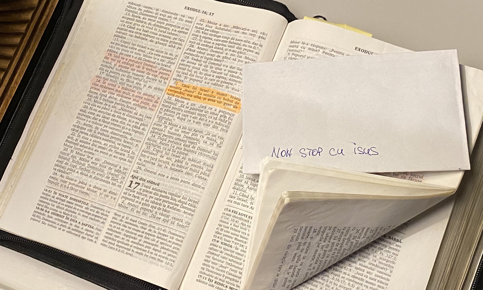 Când am deschis fermoarul bibliei, am văzut o imagine similară cu ceea ce vedeți voi în fotografia atașată. Mai multe foi ale bibliei erau îndoite și acolo era un plic pe care scria NON STOP CU ISUS, iar înăuntru erau 600 RON! Exact suma de care avem nevoie. Nu vorbisem cu nimeni, nu am cerut ajutorul nimănui, nici măcar nu am spus oamenilor provocarea pe care o aveam.